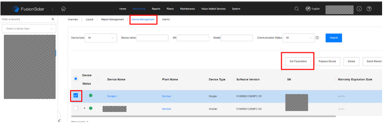 Access the target plant. Click on Device Management->Check the box of the SmartDongle->Click on Set Parameters. The Firmware of the SmartDongle need to be V100R001C00SPC127 or newer.