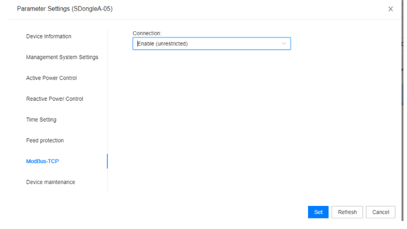 Settings >> Communication configuration >> Dongle parameter settings >> Modbus-TCP >> Enable (unrestricted)